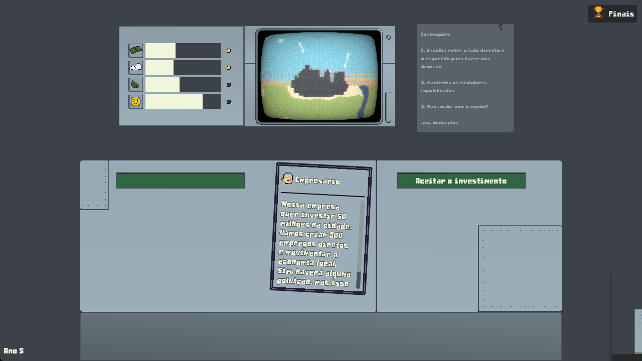 Observe o mundo reagir às suas ações. Veja o céu ficar limpo ou coberto de fumaça. Sinta a economia florescer ou a cidade murchar. Cada deslizar de dedo molda o equilíbrio delicado entre a prosperidade e a sobrevivência do ecossistema.